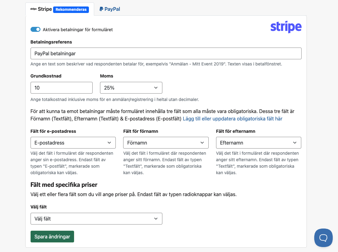 Betalningar via dina formulär i Formogram sker genom någon av betaltjänsterna Stripe payments eller PayPal.